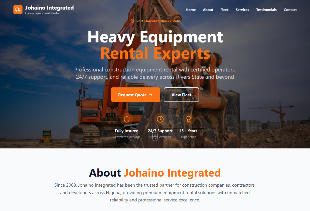 Johiano Integrated needed a platform that clearly showcased their heavy equipment fleet and streamlined client inquiries.